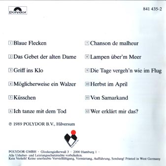 blaue flecken das gebet der alten dame griff ins klo möglicherweise ein walzer küsschen ich tanze mit dem tod chanson de malheur lampen über'm meer die tage vergeh'n wie im flug herbst im april von samarkand wer erklärt mir das ?