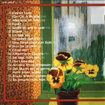 kleiner fratz alles was ich hab' kind weißt du wie es war blüten ich hab' ein zärtliches gefühl eine geschichte von gott sin für unsinn ohne dich klitschnasse clowns sie sagt nicht vieldas liebeslied an eine ferne prinzessinder mann, der so gerne nicht mehr leben wollte etwas wärme suchenbis jemand mich hört