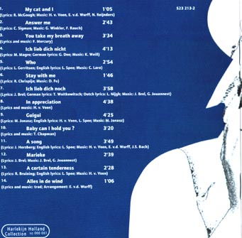 my cat and I answer me you take my breath away ich lieb dich nicht who stay with me ich lieb dich noch in appreciation guigui baby can I hold you? a song mariekea certain tendernessalles in de wind