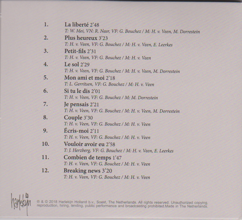 La libert้ 248 T: W. Mei, VN: R. Nasr, VF: G. Bouchez / M: H. v. Veen, M. Dorrestein Plus heureux 323 T: H. v. Veen, VF: G. Bouchez / M: H. v. Veen, E. Leerkes Petit-fils 231 T: H. v. Veen, VF: G. Bouchez / M: H. v. Veen Le sol 229 T: H. v. Veen, VF: G. Bouchez / M: H. v. Veen, M. Dorrestein Mon ami et moi 218 T: L.Gerritsen, VF: G. Bouchez / M: H. v. Veen Si tu le dis 201 T: H. v. Veen, VF: G. Bouchez / M: M. Dorrestein Je pensais 221 T: H. v. Veen, VF: G. Bouchez / M: H. v. Veen, M. Dorrestein Couple 330 T: H. v. Veen, VF: G. Bouchez / M: H. v. Veen ษcris-moi 211 T: H. v. Veen, VF: G. Bouchez / M: H. v. Veen Vouloir avoir eu 258 T: J. Herzberg, VF: G. Bouchez / M: H. v. Veen, E. Leerkes Combien de temps 147 T: H. v. Veen, VF: G. Bouchez / M: H. v. Veen Breaking news 320 T: H. v. Veen, VF: G. Bouchez / M: H. v. Veen |