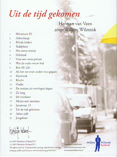 1. Hilversum III 2. Achterlangs 3. Blinde leiders 4. Teddybeer 5. Het eerste meisje 6. Ochtend 7. Voor een verre prinses 8. Wat de oude vrouw bad 9. Ben Ali Libi 10. Als het net even anders was gegaan 11. Huiswerk 12. Klacht 13. Oudje 14. De meisjes uit vervlogen dagen 15.Zo lang 16. De voorkant 17. Meisje met anorexia 18. Javastraat 13 19.Uit de tijd gekomen 20. Adieu café 21. Jongeheer speciale uitgave rond het Willem Wilmink Festival in Enschede, 2009.